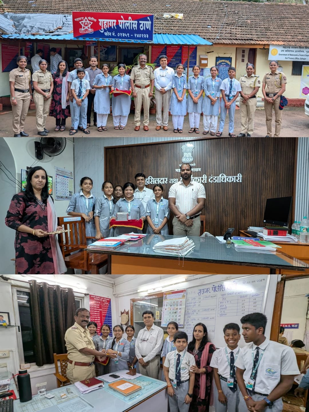 आपले रक्षण करणारे पोलीस ठाणे गुहागर येथील पोलीस निरीक्षक सचिनजी सावंत साहेब व सर्व कर्मचाऱ्यांना तसेच गुहागरचे कार्यतत्पर तहसीलदार मा. परीक्षित पाटील साहेब यांना गुहागर तालुक्यातील बालभारती पब्लिक स्कूल अंजनवेल येथील विद्यार्थिनींनी राख्या बांधून रक्षाबंधन सोहळा साजरा केला. यावेळी विद्यार्थ्यांसोबत शाळेचे प्राचार्य सुरजित चटर्जी, शाळेचे शिक्षक राहुल हेगीष्टे सर, सौं. जान्हवी आर्यमाने मॅडम आदी उपस्थित होते.