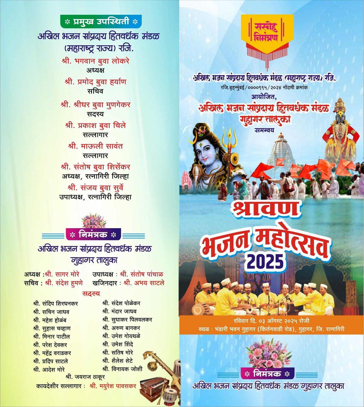 गुहागर तालुक्यामध्ये प्रथमच श्रावण भजन महोत्सव 2025 चे आयोजन रविवार दिनांक 3 ऑगस्ट रोजी करण्यात आले आहे. भजन परंपरा टिकून राहणे कलाकाराला आपली कला जोपासता यावी आणि भजन माध्यमातून समाजप्रबोधन व्हावे आणि हिंदवी भागवत सनातन धर्माचा पताका उंच उभारावा या उदात्त हेतूने ईश्वर रूपे सेवेचा मिळालेला वारसा जपता यावा आणि जनतेला त्याचा लाभ व्हावा म्हणून तसेच वृद्ध कलाकारांना वृद्ध काळात दुसऱ्यावर अवलंबून न राहता त्यांना आपण केलेल्या कलेच्या सेवेचा शासनाकडून मोबदला मिळावा तसेच सर्व भजनी कलाकार एक व्हावे, सर्व भजनी कलाकार संघटित राहावे यासाठी या श्रावण भजन महोत्सवाचे आयोजन करण्यात आले आहे.